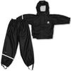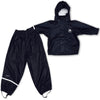 Dieses unifarbene Set besteht aus einer Regenjacke und einer Latzhose mit verstellbaren Trägern (Größe 70-100) bzw. einer Regenhose mit elastischem Taillenbund (ab Größe 110).